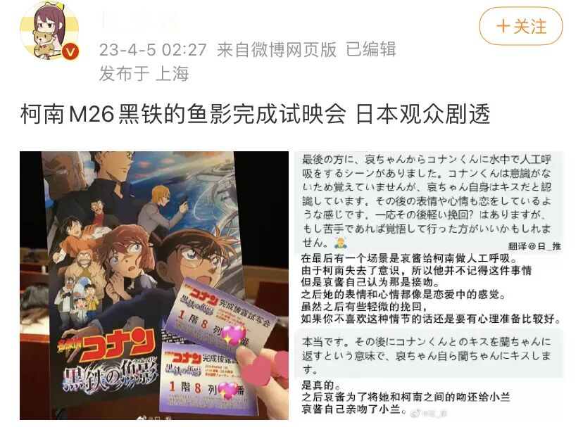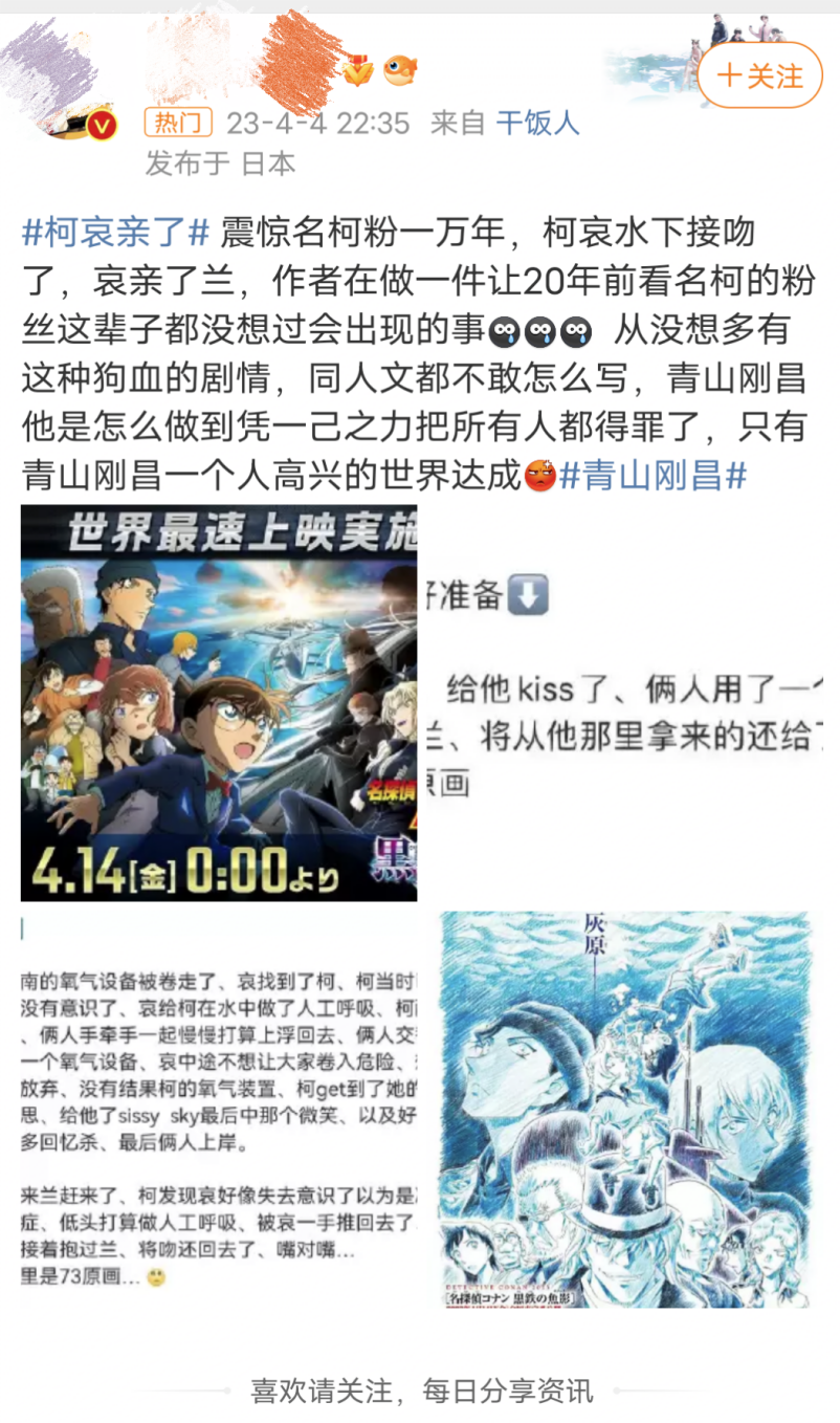 4月4日晚上小编在刷微博时看到“柯哀亲了,兰哀亲了”等词条上了热搜,热度直冲榜首,感到有些震惊,不过这个热搜却引得小编室友痛骂连连,她是《柯南》的资深粉,收藏了很多关于《柯南》的漫画书,周边,每一年上映的剧场版电影都要去捧场,甚至为了看“生肉”漫画去自学日语,这个剧透对于深爱《柯南》的粉丝而言确实有些捉摸不透。