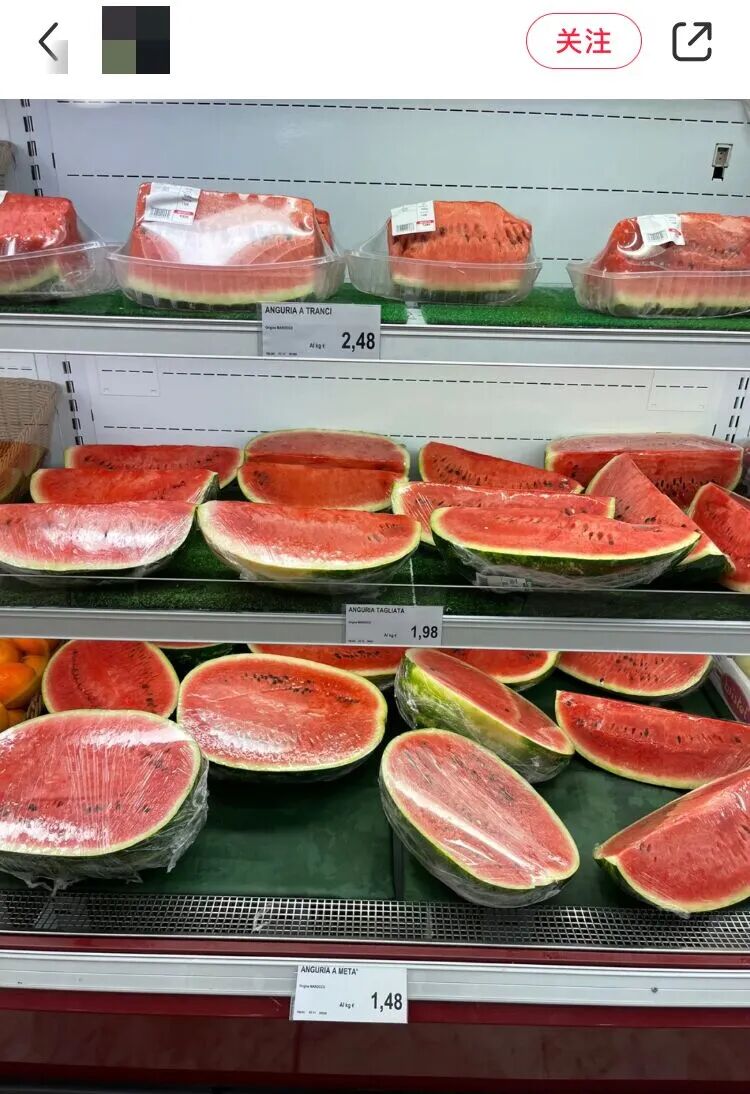 其中一个原因就是贵,有网友分享在德国超市购物,买了28欧的东西, 有10欧都是瓜钱,一个西瓜够买四斤排骨。而且欧洲的西瓜还特别大,一个西瓜两个人肯定吃不完,超市里切得越小的卖得越贵;在日本就连一盒西瓜皮都需要5块钱。