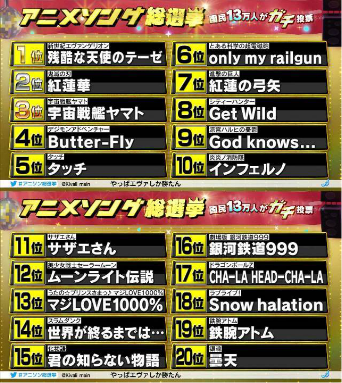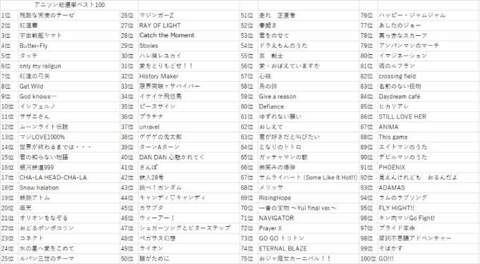 这不,13万网友票选出来的最喜欢的动漫歌曲名单新鲜出炉了: