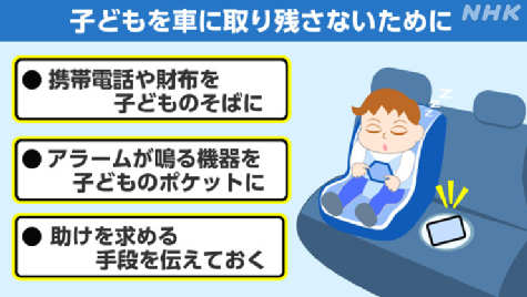 为了减少将儿童留在车上的概率,北村理事提出了几个小方法:①将手机钱包之类一定要拿下车的东西放在儿童旁边 ②将一离开就会发出声音的机器放进儿童的口袋。这几个小方法都可以有效减少儿童被滞留的概率。