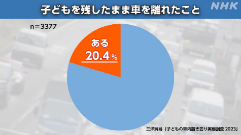 除了幼儿园巴士,将孩子遗留在家用车内的情况依旧存在。在今年5月-6月中的民间调查中,大约有20.4%的驾驶员(搭载过小学生和幼儿的车辆)表示曾经将孩子遗留在车上自行离开过。71.5%的人则表示曾经见到过被遗留在车上的儿童,但都只是匆匆而过并未上前进行帮助,可以说在这件事上,完善措施以及加强措施的实施力度迫在眉睫。