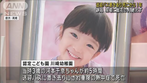去年9月5日,在牧之原市的“川崎幼儿园”的停车场内,当时3岁的河本千奈被发现遗留在车内5个小时,最终因为重度中暑而不幸去世。因为这起事件,驾驶这辆幼儿园巴士的园长等4人以懈怠安全管理导致过失致死理由送检,是否要被检方起诉还需要进一步处理。