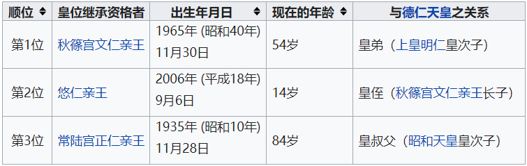 要说清楚这个问题,首先让我们来了解一下日本皇位继承顺位。