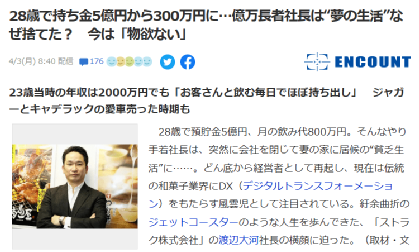 23岁时他的年收入就达到了2000万日元。敢想敢干的渡边大河有了本金开始尝试创业,开了人生第一家健康食品公司然后一直开到第五家,28岁时他的个人存款就高达5亿日元,实现了亿万富翁的梦想。