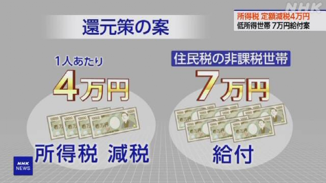 在返还措施方面,日本政府计划在过去两年的税收增额部分中,以每个人4万日元定额减税的方式进行返还,而对于低收入人群,将给予非缴税人群每个人一次性7万日元的补偿。