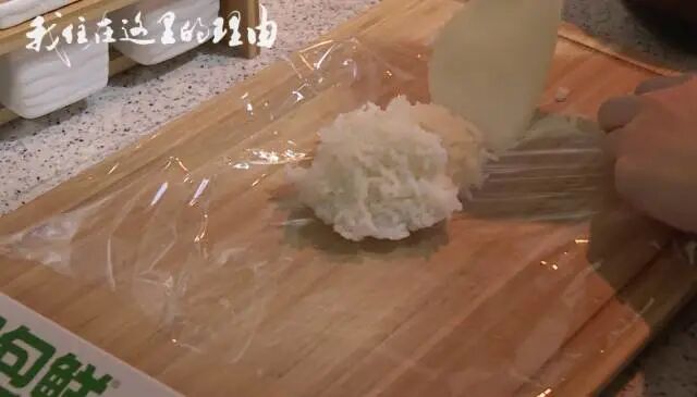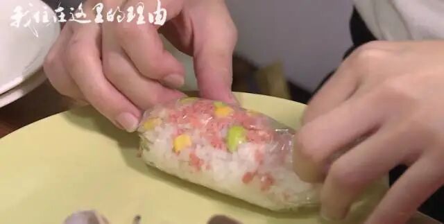 跟着妈妈一起制作糖果饭团,将金枪鱼、玉米粒以及毛豆粉扮进饭中,再用保鲜膜卷起来。