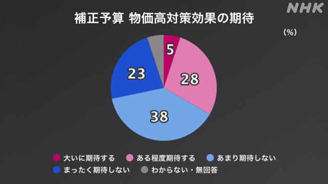 而在NHK提出的特定问题中,关于物价以及税收方面的问题得到了回答人的广泛关注。在对于住民税中对于非缴税人群的补助、天然气费用的负担减轻的延长之类的措施方面,当被问及“(通过这些措施)对于物价的下降是否抱有期待”时,5%的人表示“很有信心”,28%的人表示“一定程度上抱有期待”,38%的人表示“不太抱有期待”,23%的人则表示“完全没有期待”。