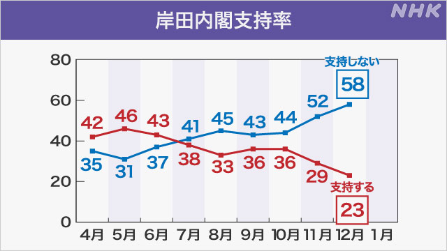 据悉,NHK官方从12月8日开始进行了为期三天的舆论调查。以日本全国18岁以上的人群作为对象,采用随即拨打电话的方式(包括座机和手机)进行调查,在属于调查对象的2368人中,有1212人进行了回答。根据调查的结果显示,11月岸田内阁的支持率为23%,也是自2012年12月自明党再度执政以来支持率最低的一次。