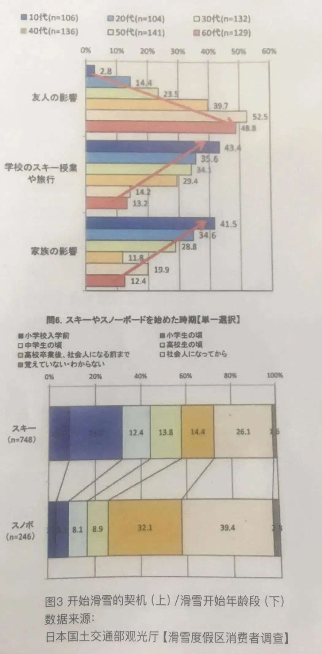 开始滑雪的契机(上)开始滑雪的年龄段(下)