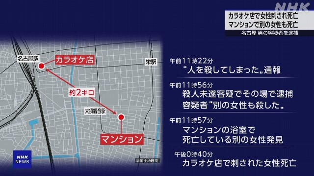 12月26日上午,在名古屋站附近的某家卡啦OK馆内,一位20岁的女性被刺杀致死,日本警方在接到报警之后将该名再次杀人未遂的男性嫌疑人抓获。嫌疑人还称自己将另一位女性摁在浴缸里将其溺死,警方也在名古屋市内的一处房屋内找到了女性的尸体,现在该起案件还在调查中。
