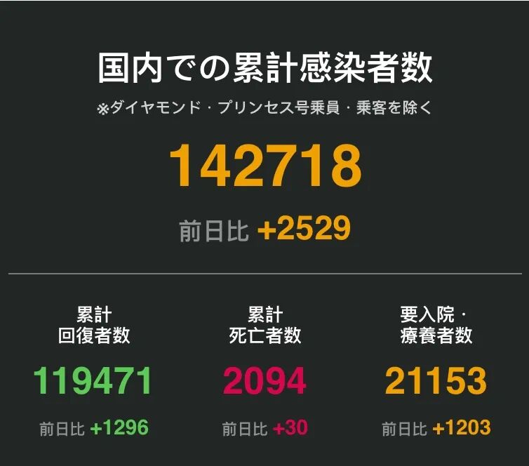 11月27日东京新增人数570人、爱知县新增234人均为最高的一天,日本当日全国新增人数为2529人累计14万2718人,新增死亡人数30人累计2094人,出院人数1296人累计11万9471人。