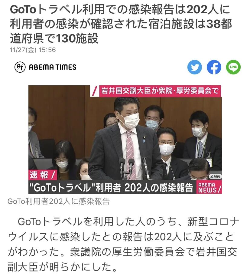 别急,就在27日众议院厚生劳动委员会成员就给出了统计数据表明,截止到26日,利用Go To Travel出行的人群中目前能统计到的感染人数就有202人,共涉及到38个都道府县共计130个设施。其中住宿酒店等被感染的员工有177人。