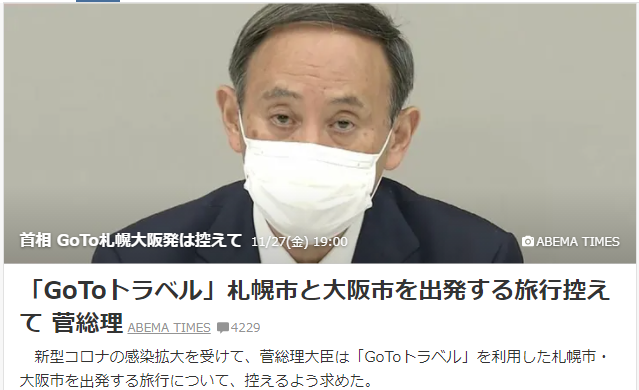别忘了,日本还不能像国内那样完全追踪到一个感染者的所有行踪,恐怕实际人数要比这个统计多得多。目前日本已经将大阪和札幌从Go To Travel计划中除去,菅义伟首相也呼吁人们不要再去这两个地方。