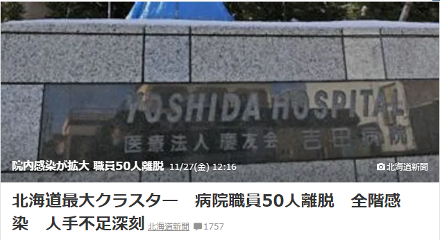 该医院在本月6日的时候有两名护士被确诊,随后第二天增加到7人,旭川市保健所立刻对全医院患者及工作人员进行PCR检测。由于该医院基本都是密闭空间,导致整个7层楼全部都有被感染的人,而这所医院大部分的患者都是70~90岁高龄人群且多是癌症晚期或重病患者。