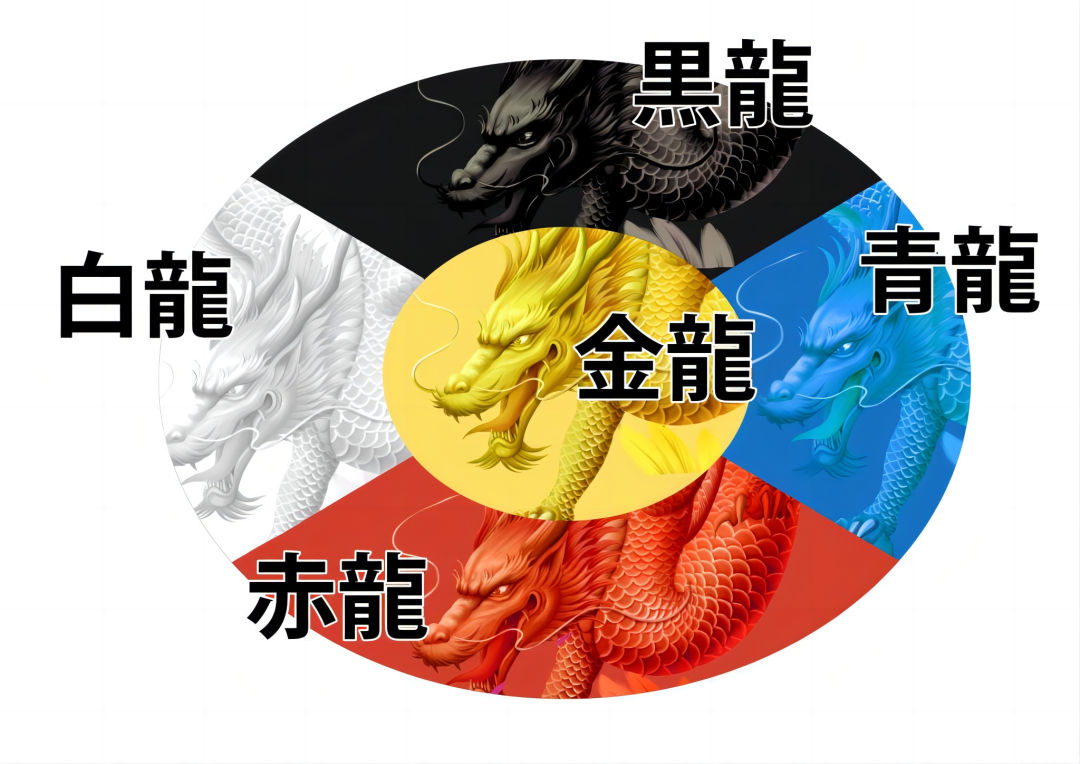 既然说到【龍】,那就不得不提一下同样由我国传入日本的“四神信仰”和“五龙之说”。所谓的“四神信仰”源于星辰崇拜,在二十八宿体系形成后,人们根据其方位,每七宿组成一种动物形象,即四象或“四宫”。也就是我们现在常说的东苍龙,南朱雀,西白虎,北玄武。其中,青龙白虎掌四方,朱雀玄武顺阴阳,维护世界和平。