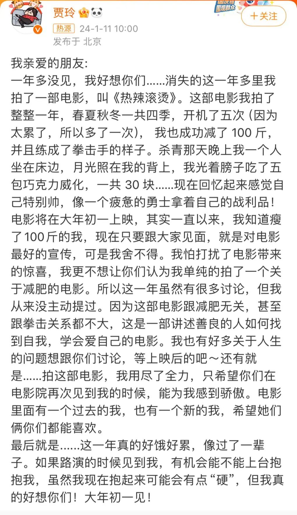 早在1月11日,一条“贾玲瘦了100斤”的热搜引爆微博,大家在惊叹贾玲的毅力的同时,发现这原来她是为了拍摄电影《热辣滚烫》而作出的改变。贾玲自己也发了微博描述了拍摄电影一年时间里的感受。