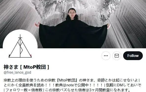 因为日本法律规定禁止基于意识形态或者信仰的歧视,必须尊重他人的宗教信仰。久野元弘也就是抓住这个“漏洞”,通过正规途径申请并获准成立了“MtoP神教”。为此,他还专门为自己的宗教设计了徽章,注册了推特账号。