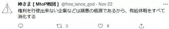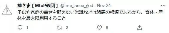 MtoP神教除了提倡拒绝加班外,还提出了很多人性化的教义,像首先要保障孩子和家庭幸福,不履行就是犯罪,请最大限度地使用育儿假和产假;