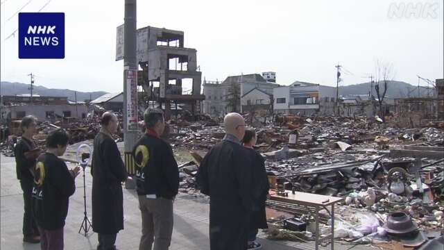 在因为地震发生大规模火灾的石川县轮岛市的朝市通り的废墟附近,有人在该处进行祈福。有一位住在轮岛市市内的70岁女性,来到了曾经为自己做帮扶服务的朋友家附近,因为不知道这位朋友是否平安,所以双手合十进行祈祷。