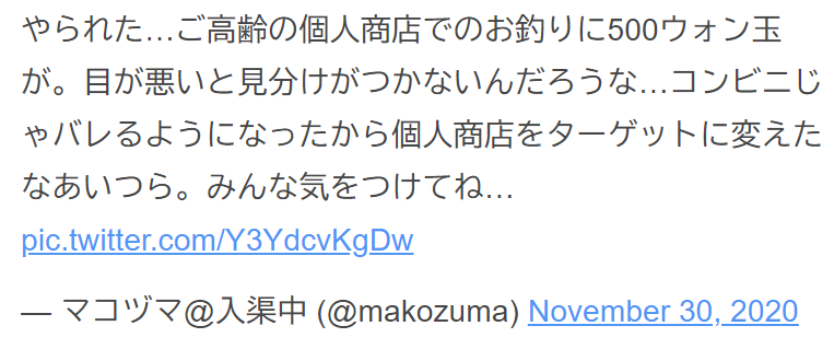 其实500日元和500韩元的问题不仅仅出现在老年个体经营户上,也出现在各年龄层上且这个问题已经存在很长时间了。最近出现的针对老年个体经营户是一种诈骗,但是也不排除真的是对方意外搞错的情况。