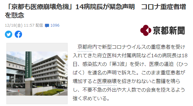 这样的人数下病床数的使用率增高,这会让更多转向重症的患者得不到及时的救治,现在东京、京都等医疗机构已经多次发布医疗崩溃预警声明,希望市民能够自觉起来。