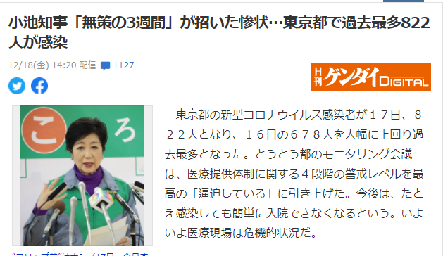 可即便这样,12月17日日本东京的新增确诊人数还是又一次刷新了记录从16日的最高记录678人一下蹿到了新高822人!这让很多人都感觉,破千恐怕也是“指日可待”了