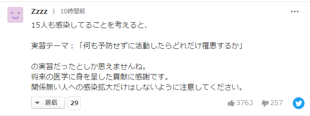 大意:15人感染,我能想到的只能是他们是在进行一个“不采取任何预防措施行动的话会有多少感染的可能性”的实习课题。的确,对未来医学贡献不惜用自身来实践研究,很感谢你们,但请不要伤及到其他无关的人。