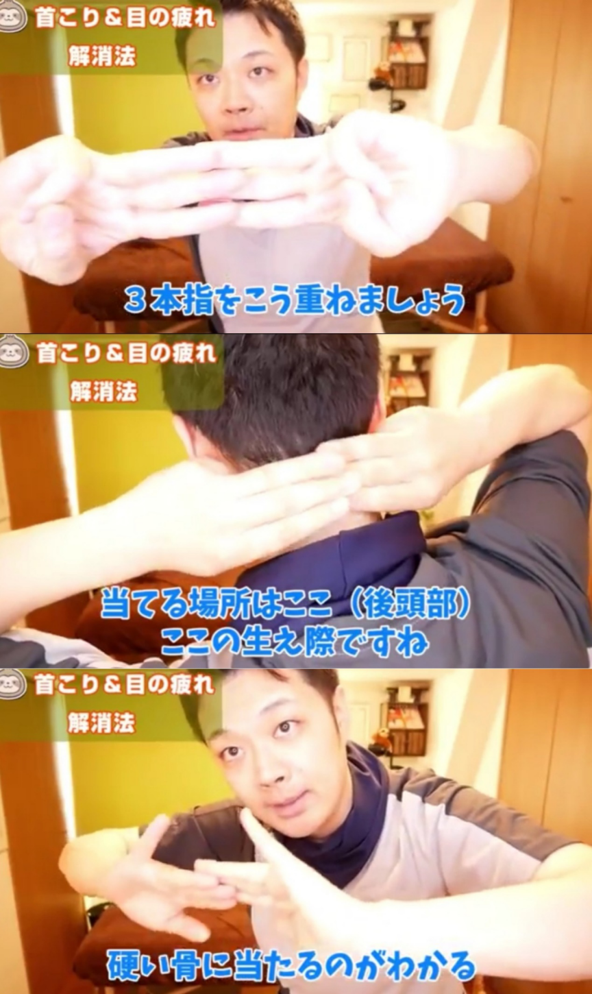 重叠后的手指,放在后颈的发际线处的正中心。这个位置你应该会感受到有坚硬的骨头。
