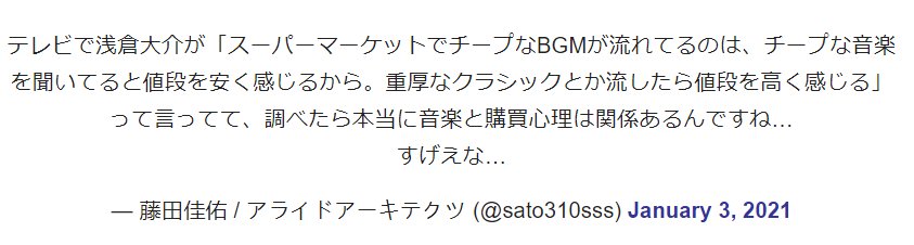 音乐制作人浅倉大介曾在接受访谈时说,‘超市播放廉价的音乐,会使得顾客在听到后感觉商店的价格很便宜;相反之下,如果它们播放严肃的古典音乐,会使得人不由自主地联想到高价。