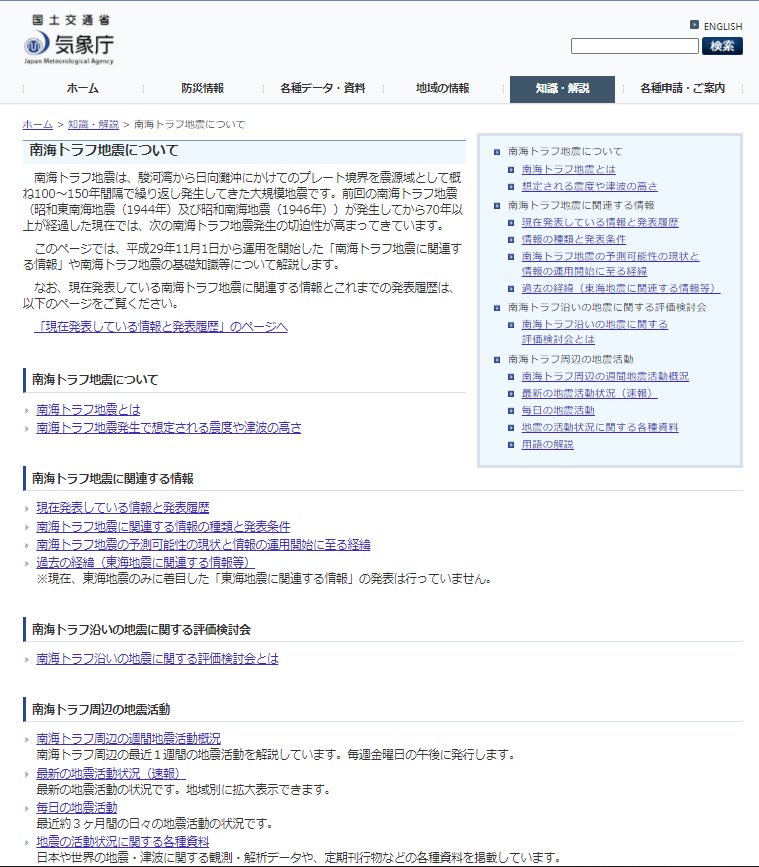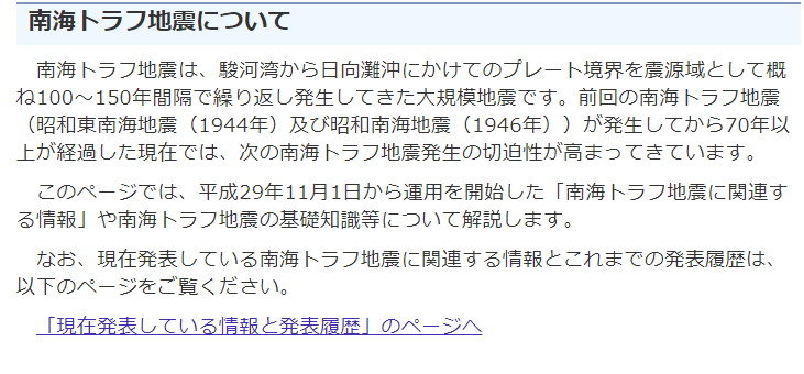 日本国土交通省早就对这件事产生了高度重视。点开气象厅网址,就能了解到有关南海地震的大量信息。在介绍南海地震的文章第一段就提到了‘震源区域每隔100-150年就会发生大规模地震,因此继上次1944、1946年发生之后过去70年的现在,再次发生南海地震的可能性极其高。’