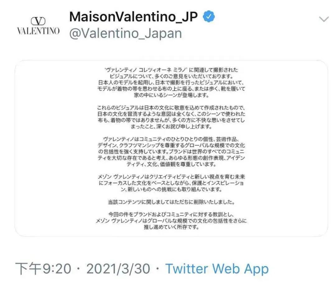 这则新闻在日本雅虎上出现不久后,华伦天奴主动撤下了所有相关内容,并在推特上发表了道歉声明
