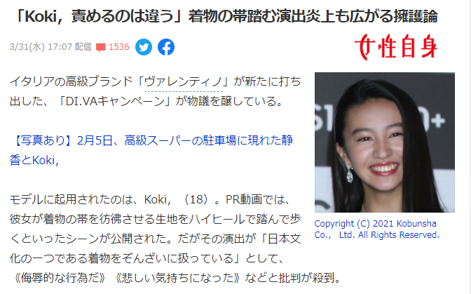 前不久,木村拓哉的二女儿18岁的木村光希(Koki)接拍了意大利奢侈品牌华伦天奴的最新宣传片,结果因为片中踩着和服腰带,被日本媒体指责更是被骂上了新闻。
