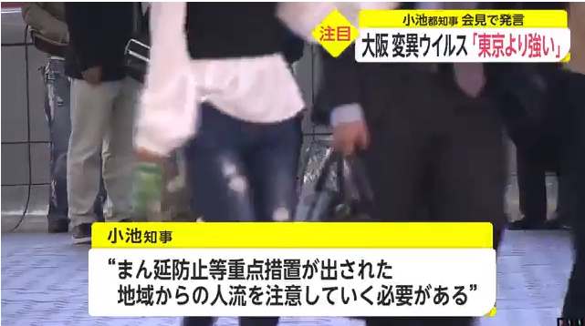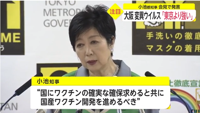 面对大阪目前的情况,东京都小池知事表示大阪的变异病毒感染性更强,需要大家多多注意,同时也建议日本政府尽快推进国产疫苗的研发。