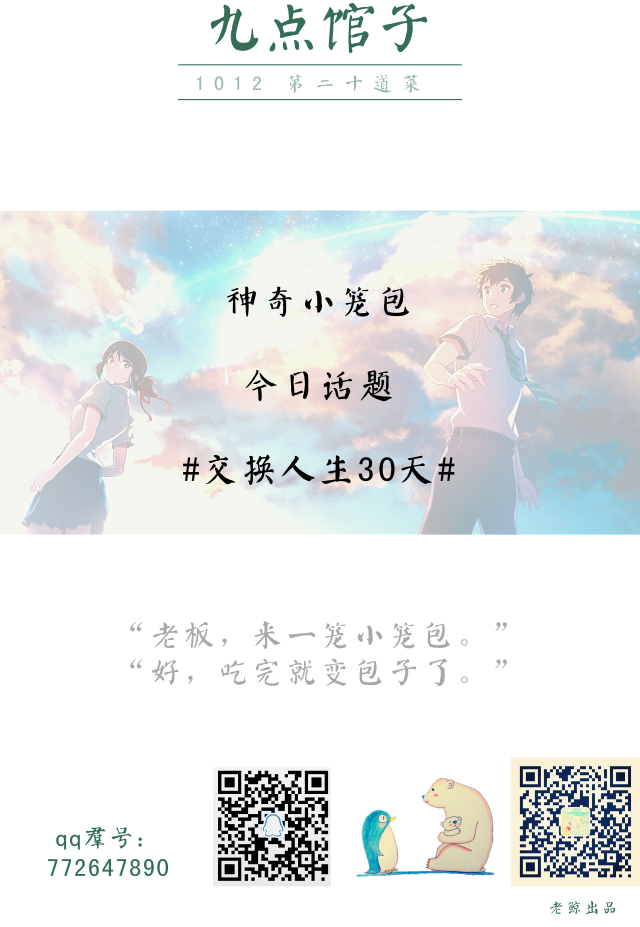 今天,想问问大家,如果给你一笼神奇小笼包,和你一起吃下的人,能够和你交换人生30天,你会和谁共进晚餐呢。