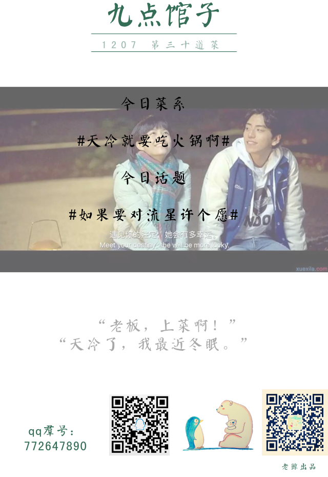 雄 2018/12/14 9:51:00#假如要对流星许个愿# 少点包袱,顺其自然再找一个(长)头发的对象【路人】番茄 2018/12/14 9:46:33#假如要对流星许个愿# 同求在此找到快乐年糕 2018/12/14 9:34:30#假如要对流星许个愿# 我希望自己可以在这个学校找到快乐 还有真正的开心【路人】方中山胡辣汤 2018/12/14 9:19:42#假如要对流星许个愿#我希望我可以进化到控制我自己的某个器官系统,比如说,耳朵。我希望晚上睡觉的时候,我是个聋子,这样我晚上就不会被呼噜声,磨牙声,室友回宿舍的声音吵醒了。【路人】焖面大王 2018/12/13 18:26:36#假如要对流星许个愿#变有钱,暴富,流星你实现不了的话就砸我面前吧说不定也能卖个好价钱【大侠】干炒牛河,潮汕牛丸与梅菜扣肉 2018/12/10 14:52:59#假如要对流星许个愿#找到两情相悦的人。像叶剑英元帅那样,功成名就,衣锦还乡,保护自己的家乡。【路人】芋圆双皮奶 2018/12/10 14:41:24#假如要对流星许个愿#愿自己和自己的小伙伴们都能开开心心的吧毕竟对于现在的自己开心真的很难得山楂 2018/12/10 14:29:26#假如要对流星许个愿#希望我爱的她能懂我。蔓越莓 2018/12/10 13:13:53#假如要对流星许个愿#希望高数和c语言对我好一点【路人】柚子 2018/12/10 12:32:38#假如要对流星许个愿#希望我爱的人幸福平安健康快乐永远,自己可以越来越优秀,未来会很好【管理员】水果拼盘 2018/12/10 12:30:33#假如要对流星许个愿#希望我爱的人和爱我的人幸福一生拔丝地瓜香蕉派 2018/12/10 12:29:52#假如要对流星许个愿#希望这学期成绩贼高【路人】雪花姐姐 2018/12/8 8:57:20#假如要对流星许个愿#希望所有我爱的和爱我的人一切顺意【路人】西红柿面条 2018/12/8 8:53:40#假如要对流星许个愿#平安喜乐 简单有趣【路人】粉蒸肉 2018/12/8 8:16:43#假如要对流星许个愿#我愿可以什么都不知道,无知的活在自己的梦里【师兄】肉夹馍 2018/12/7 23:35:14#假如要对流星许个愿#愿趁着年轻,多经历一些值得在以后日子慢慢回忆的事,多结识一些优秀的或是有趣的朋友。【少侠】皮皮的巧克力 2018/12/7 23:29:41#假如要对流星许个愿#我希望,我能再一次找到方向,并且不会迷路大盘鸡呀大盘鸡 2018/12/7 23:28:51#假如要对流星许个愿#我希望自己嘴唇厚一点,这样在寒风的摧残下,流血了。。。【路人】葱油拌面 2018/12/7 23:26:19#假如要对流星许个愿#我希望我变成流星,天天给你们许愿【路人】柠檬冰红茶plus 2018/12/7 23:21:43#假如要对流星许个愿#爱情圆满,维持恒久。 事业成功,平步青云。 父母康健,天伦永在。 妻贤子孝,家庭和乐。兄弟朋友,义薄云天。【路人】薯条就是我 2018/12/7 23:17:56#假如要对流星许个愿#让我做个隐形人吧一次就好【路人】凉皮 2018/12/7 22:58:21#假如要对流星许个愿#我可以无忧无虑做任何自己想做的事,我可以开心的跟我爱的爱我的人一直在一起【路人】我想要两颗西柚 2018/12/7 22:57:15#假如要对流星许个愿#希望我远方的朋友们能够过的好 她的舍友能够好一点【路人】呆西瓜、 2018/12/7 22:56:42#假如要对流星许个愿#我希望自己攒够钱买图丽16-28【宗师】辣椒炒肉和土豆丝 2018/12/7 22:56:38#假如要对流星许个愿#重来青春【少侠】油炸丸子。2018/12/7 22:56:25#假如要对流星许个愿#考上西交大!鸡丝炒面 2018/12/7 22:56:09#假如要对流星许个愿#我希望钢铁侠永不谢幕。红薯 2018/12/7 22:45:52#假如要对流星许个愿#我希望我有一个主角光环。【路人】一盘酢桨草 2018/12/7 22:41:45#假如要对流星许个愿#我希望自己变成一颗流星。会有人来向自己许愿,会成全别人的愿望。【路人】驴肉火烧 2018/12/7 22:19:57#假如要对流星许个愿#我真希望自己有勇气面对你