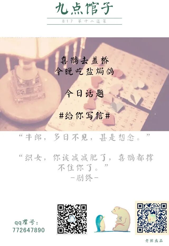 借由九点馆子在七夕节的这一天,给你一张信纸,一支笔,请为你心中那个人,写封信吧。或许写完,他/她就能收的到了。