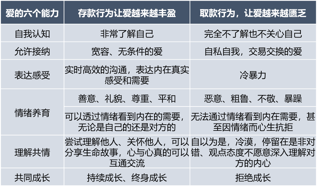 我们对应六大能力来看,有哪些行为可以让爱情账户越来越丰盈,又有哪些行为会让爱越来越匮乏。