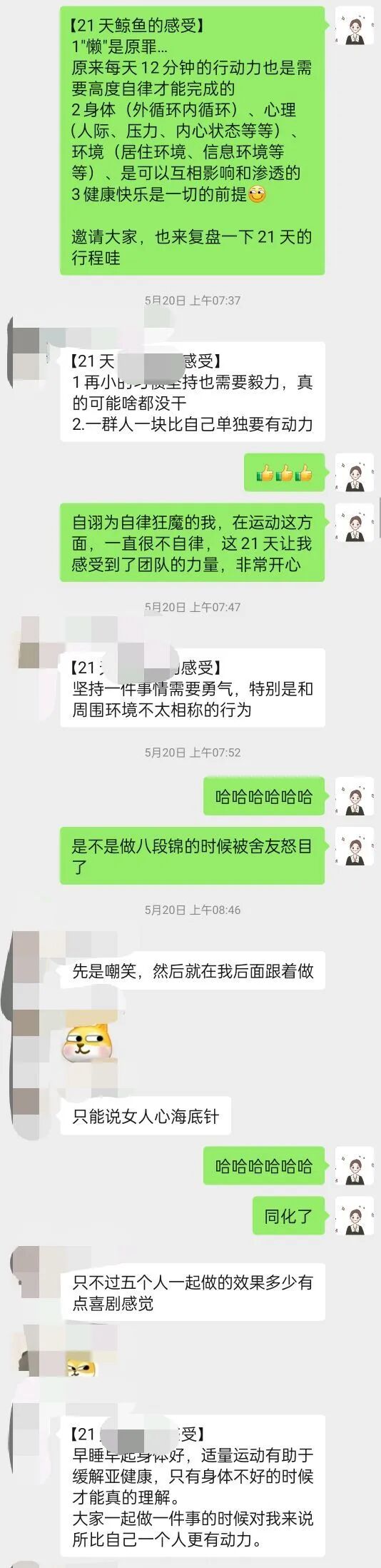 当然仅仅是体验者、好奇者就算啦,你会被我们这群"自律狂魔"的行动力执行力坚持力搞到自我怀疑,而且,只窥屏,不行动,是没有锻炼养生效果的啊哈哈哈,我们打算把这个群一直经营下去,让健康成为每天必修课。