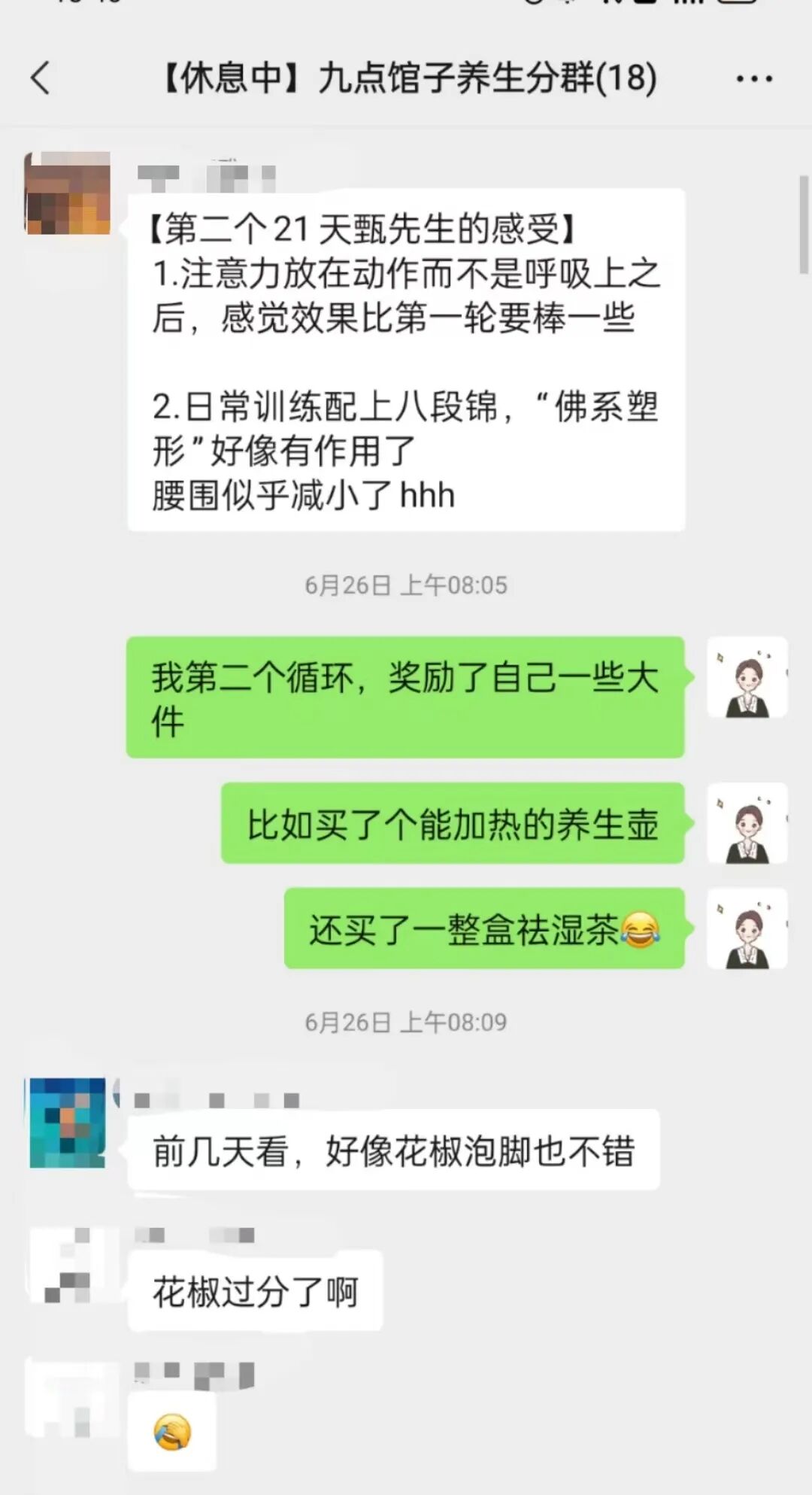 就像在上一个21天结尾的时候提到的,这个群的意义,就是号召大家,哪怕作息紊乱、饮食不规律,起码每天花12分钟做八段锦,而且能够坚持下来,带着志趣相投的小伙伴一起做,健康工作五十年!幸福生活一辈子!