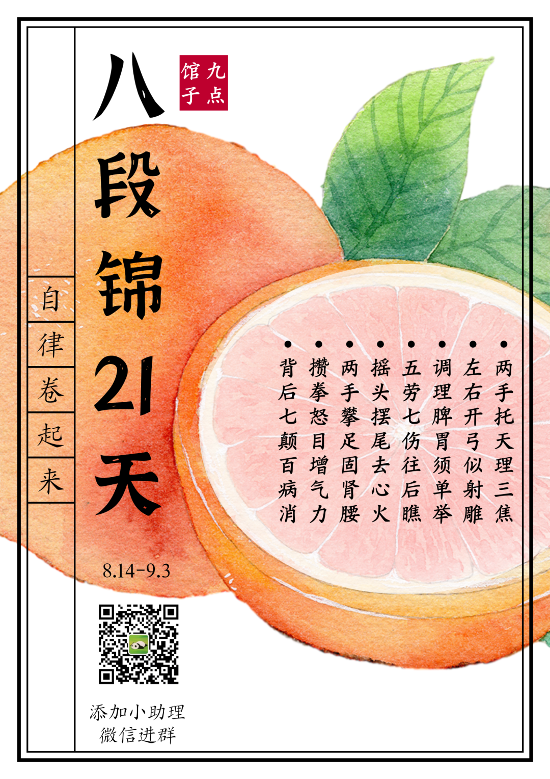 九点馆子,在今年,开启了又一个神奇的模块——养生...在蛤蟆小姐的安利下,我开始练习八段锦,在一个人练习感觉到持久度不够的情况下,我发起了这个活动,如今,我们已经顺利完成了3个21天的八段锦。