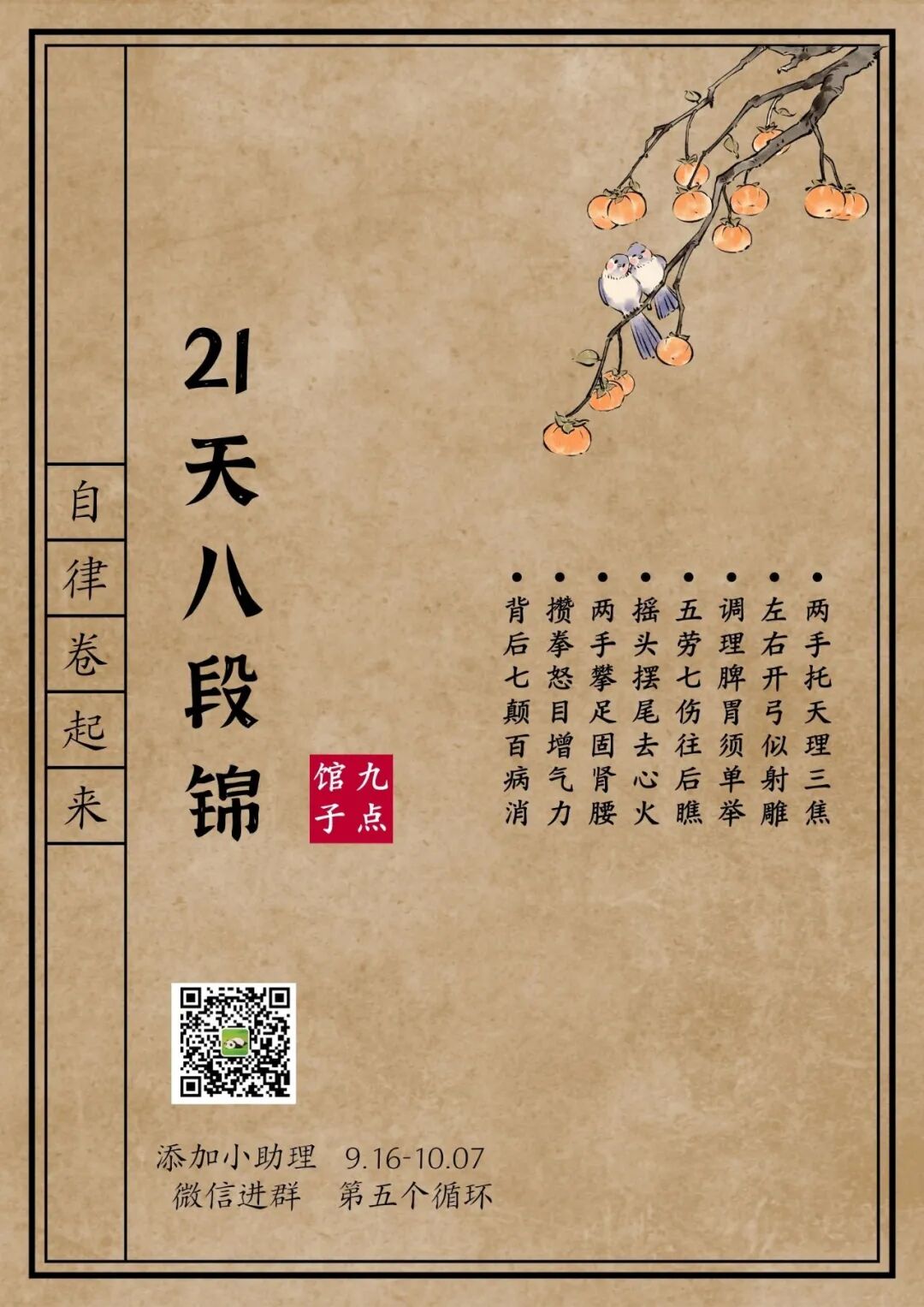 九点馆子,在今年,开启了又一个神奇的模块——养生...也就是以21天为周期,持续做21天八段锦。