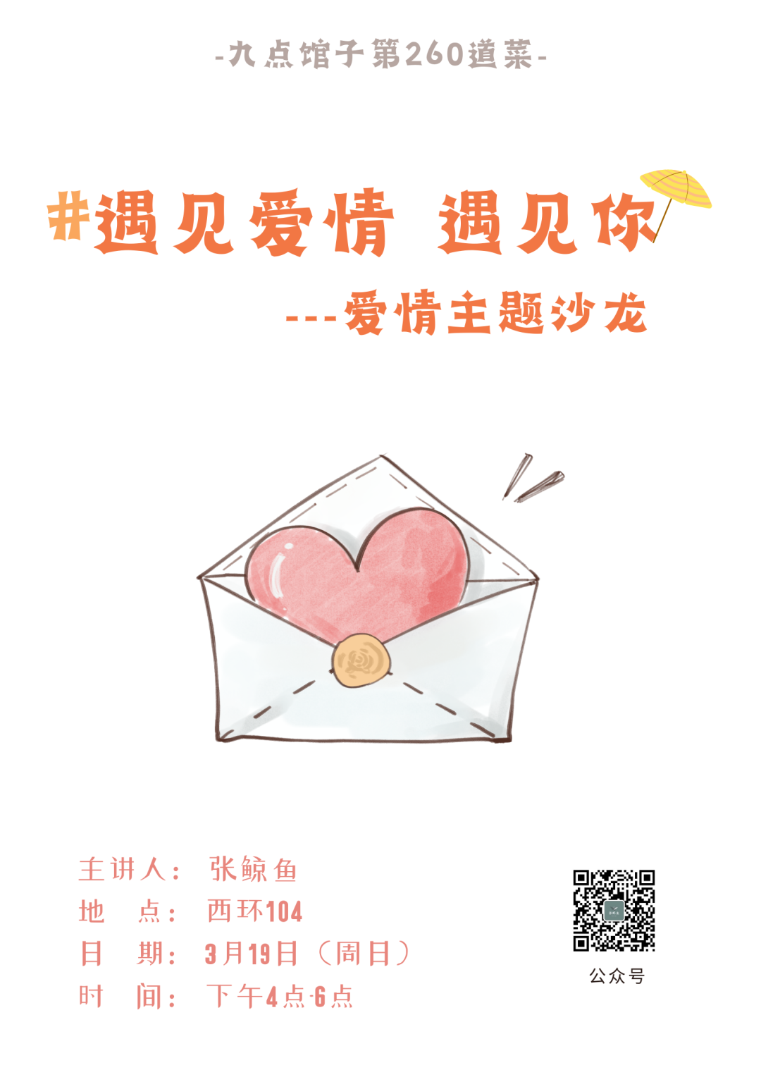 哈喽哈喽大家晚上好,我是张鲸鱼,周末就要开2023年度的第一场爱情主题沙龙了