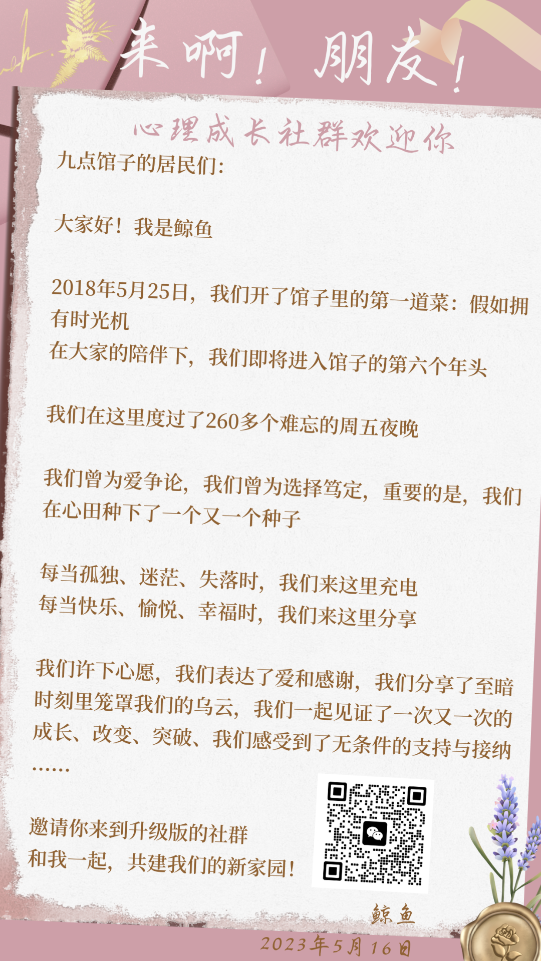 谢谢鲸鱼一直以来耐心而又真挚的交流和引导,“学会和自己对话”,“良性沟通”,真的让我受益良多,打破自我封闭的模式,与不同的人链接,人生才会更加多彩。
