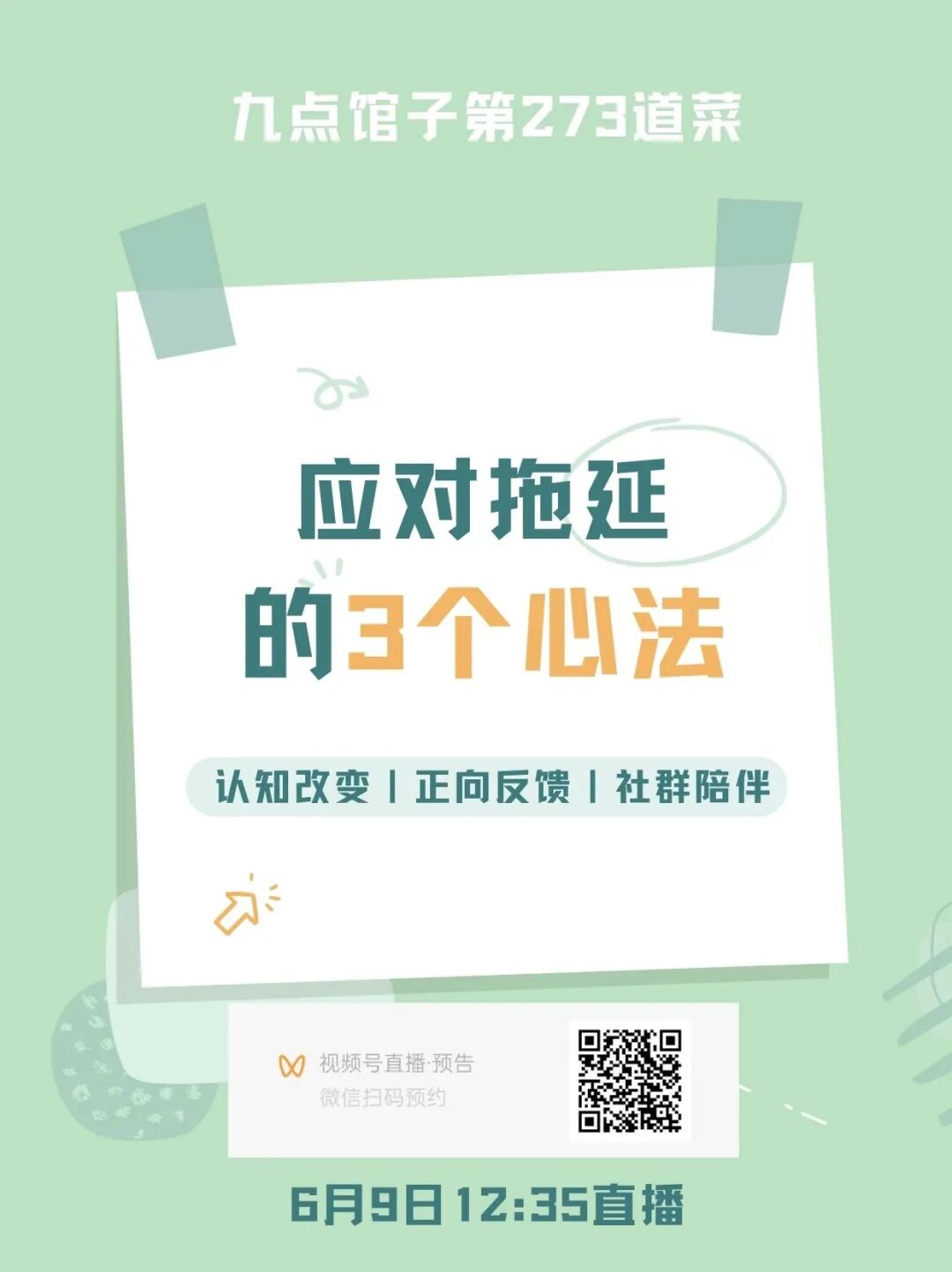 最后,预告一下,又要到周五直播的时间了,明天中午12:35,视频号小红书同步直播关于应对拖延的三个心法——认知改变,正向反馈以及社群陪伴