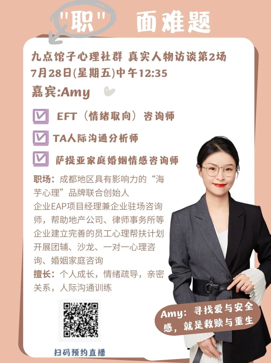 在亦师亦友的交流中,邀请Amy来直播间聊天的愿望越来越强烈,于是,7月,刚好Amyl老师的职业身份非常契合“爱与安全感”的社群主题,这场直播,如约而至