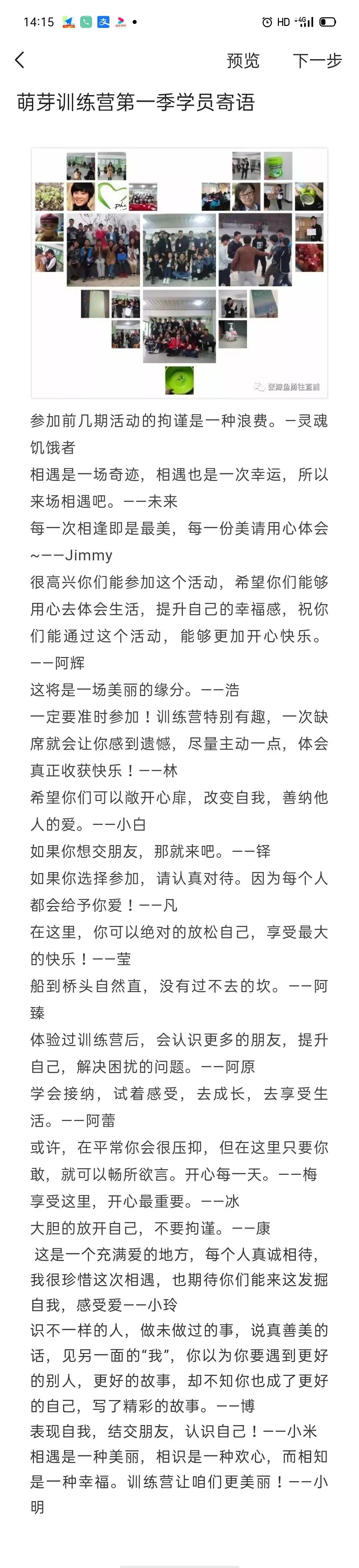 适合谁:想要突破、成长,挖掘自我潜能,借由行动认识自我的人儿,想收获积极心态的人儿,想摆脱“拖延”,苦于一个人的力量有限,需要小伙伴互相鼓励支持的人儿有什么:张鲸鱼(三级心理咨询师、职业规划师,多年心理健康团体辅导、线上社群运营经验)带领,每周一次线上分享,每周一个自我突破的任务,用小打卡全程记录成长轨迹小群互动,老师全程跟进,优秀学员(小打卡积分排名前三)获得线上咨询一次并有观影清单,书籍清单等彩蛋等你来报名方式:报名的小伙伴请添加小助理微信,填写报名表(试一试心态的不建议来,全程治愈拖延症,治愈"听过了所有道理依然过不好人生")时间跨度:2月1日-28日形式:微信群orqq群互动,小打卡小程
