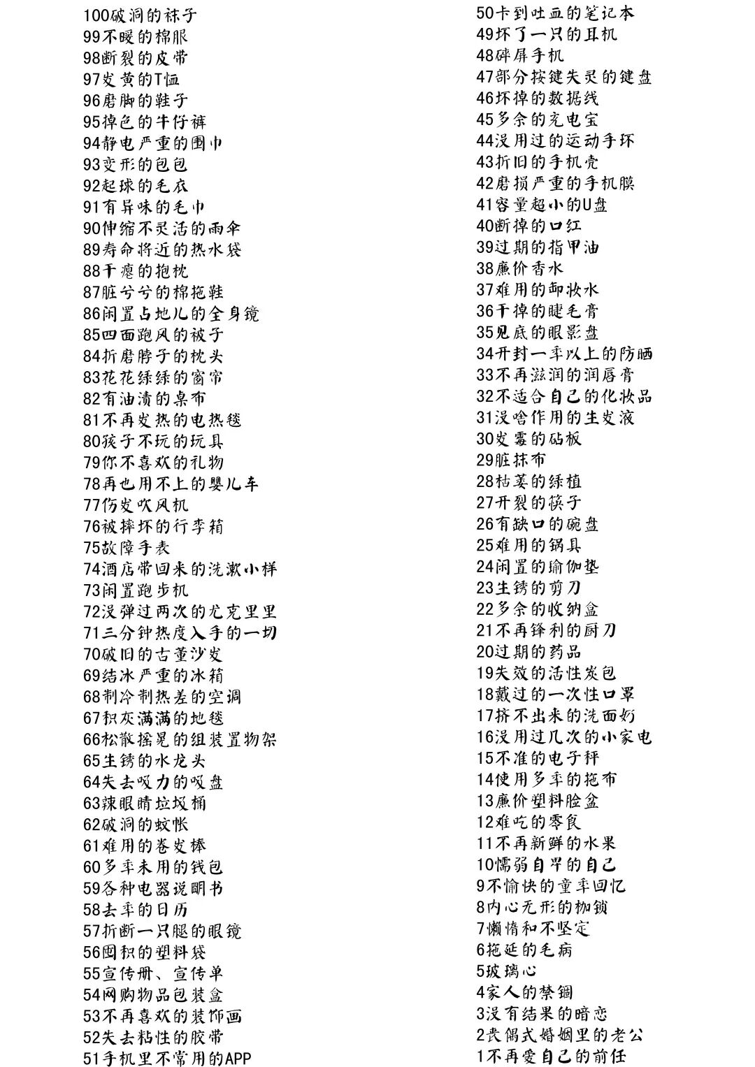 九点馆子||久点伴0111第三十四道菜今日话题:#最想扔掉的一样东西# 考完试了,课本扔了吗? 接近年关,作为一位负责人的家庭主妇,我有项很重要的工作就是整理家务。 某宝上买了各种收纳箱,准备回家收拾屋子的时候发现,家里的破烂之多,远超过我的想象... 读书的时候,沉醉各种整理收纳书籍,《怦然心动的人生整理术》《断舍离》《减法生活》,然而至今仍存留在理论阶段。 每次想扔东西的时候,就会沉醉在,呀这个还有美好的回忆,啊,那个可能过两年还能用到等等各种纠结中,好不容易收拾一下准备送去捐赠的衣服,临门一脚又会被我老妈拦下... 前两天看到了要扔掉的100样物品,在物质积累和过剩的现在,究竟何时可以去过上没有囤积,轻松愉快的生活呢?先从#最想扔掉的一样东西#开始吧! 留言请加话题#最想扔掉的一样东西#