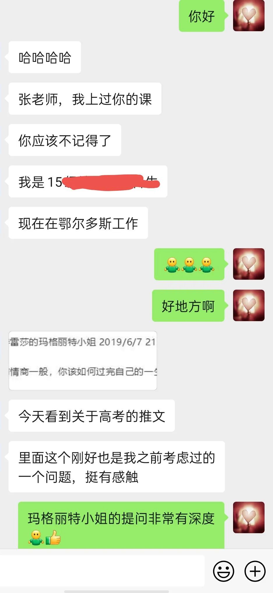 有关这个问题,我做出了一个回应,因为就在这个提问的前两天,高考主题的推文后(第55道菜)我突然收到一个加好友申请。