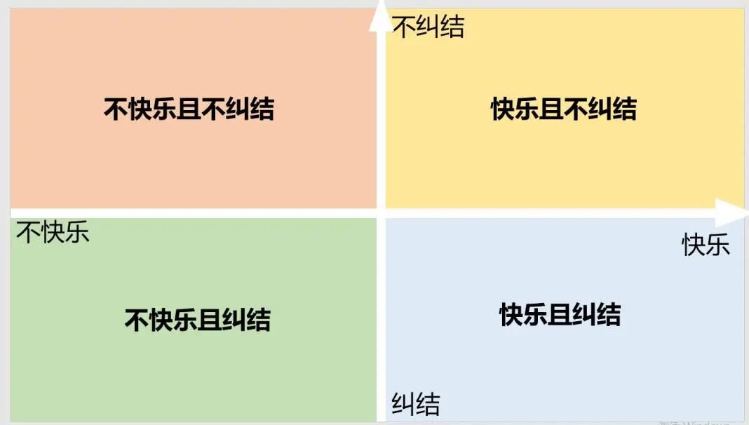 我们今天不谈快乐的高级与低级,这个标准本身就没有标准答案,随着历史的洪流逐渐答案会清晰,我们聊一聊让你快乐以及让你纠结的事情,如果拿这两个象征来做坐标轴,你自然就会得到四类事件:回顾你过往稀松平常的一天里的种种事情,种种选择,基本上也可以用这个标准来简单归类。