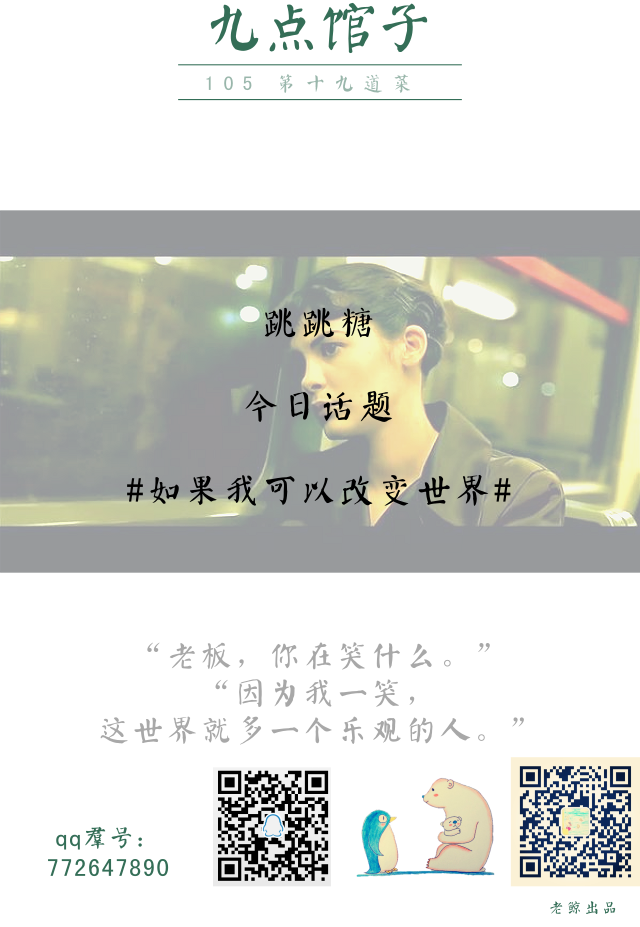 【路人】佛跳墙 2018/10/5 21:03:12#如果我可以改变世界#我希望这个世界没有争吵,没有灾难,没有离别,没有痛苦【路人】地菜饺子 2018/10/5 20:55:04#如果我可以改变世界#我首先消除国家与国家之间的恶劣关系,消灭人们心中的好战因子,就不用有那么激烈的社会竞争,与对学习的强制要求,慢慢发展经济,不会破坏青山绿水,作一个隐世君子,自给自足。所求不多,发展农作技术,一季耕种够一年生存,悠哉悠哉!【匿名】沈月生 2018/10/5 20:43:20#如果我可以改变世界#算了,不想了,我又改变不了。【匿名】胡咏梅 2018/10/5 20:42:04#如果我可以改变世界#我会更改现世伦理【掌门】四季面 2018/10/5 20:25:45#如果我可以改变世界#我想让世界充满善,少点恶【路人】三两牛肉面 2018/10/5 20:10:41#如果我可以改变世界#我希望将如果去掉【宗师】辣椒炒肉和土豆丝 2018/10/5 20:07:12#如果我可以改变世界#我想让世界归我华夏一统东楠偏七 2018/10/5 19:52:26#如果我可以改变世界#希望一切只如初见【匿名】吴漪 2018/10/5 19:20:23#如果我可以改变世界#我更想世界变成没有人类这种可以超脱正常生物之外的物种,换而言之,不要有bug存在,不存在食物链顶端,像斗兽棋一样,老鼠可以吃大象那样,万物相克,生生不息,有着敬畏。【路人】一盘酢桨草 2018/10/5 19:11:10#如果我可以改变世界#我更想世界变成老子畅想的世界,鸡犬之声相闻,老死不相往来。【路人】馆子小二-鲁蛋 2018/10/5 19:07:51#如果我可以改变世界# 我希望世界的语言,钱币,度量衡全都统一起来,让世界村从地理交通概念上完全转化到方方面面【管理员】洋芋落苏 2018/10/5 19:07:38#如果我可以改变世界#我只需要让别人知道我能改变世界,但并不去做【路人】方中山胡辣汤 2018/10/5 19:06:53#如果我可以改变世界#我希望我可以做出来一个穿越千山万水的任意门,给那些需要人,让他们与爱的人之间不再有距离,他们随时可以拥抱到想拥抱的人,那些难捱的时刻都会变成幸福的瞬间。真正的实现 所爱隔山海,山海皆可平。ASK 2018/10/5 19:04:40#如果我可以改变世界# 希望世界能更公平和谐【路人】@柠檬 2018/10/5 19:03:01#如果我可以改变世界#那就让我生活的地方变成大冰笔下的江湖吉安炒粉 2018/10/5 18:59:37#如果我可以改变世界#我要让万有引力消失【管理员】住在意大利史特雷莎的玛格丽特小姐 2018/10/5 18:57:31#如果我可以改变世界#想当一个调香师,调出以自己名字命名的香水或者开一家属于自己的甜点店做到很多人都说好好吃